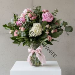 Price: $130.00Pink Peony & Rose Bouquet in Glass Vase